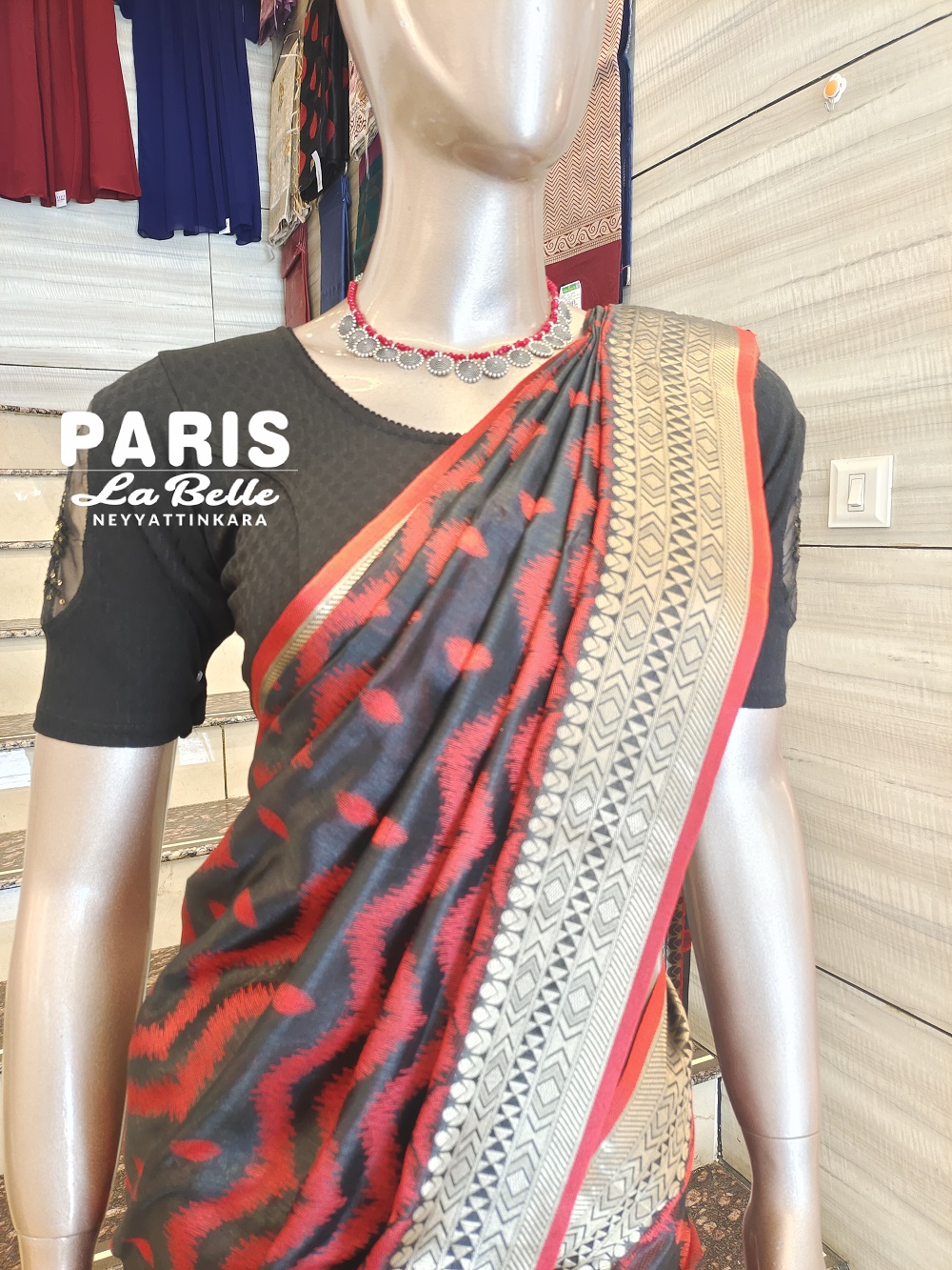 The saree features a Pochampally pattern. A classic high contrast combination of charcoal black and crimson red.