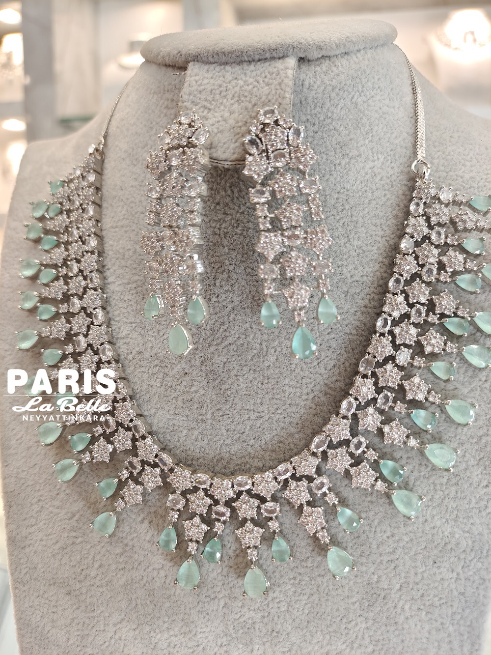 A matching duo consisting a bib style necklace and a long chandelier earring.