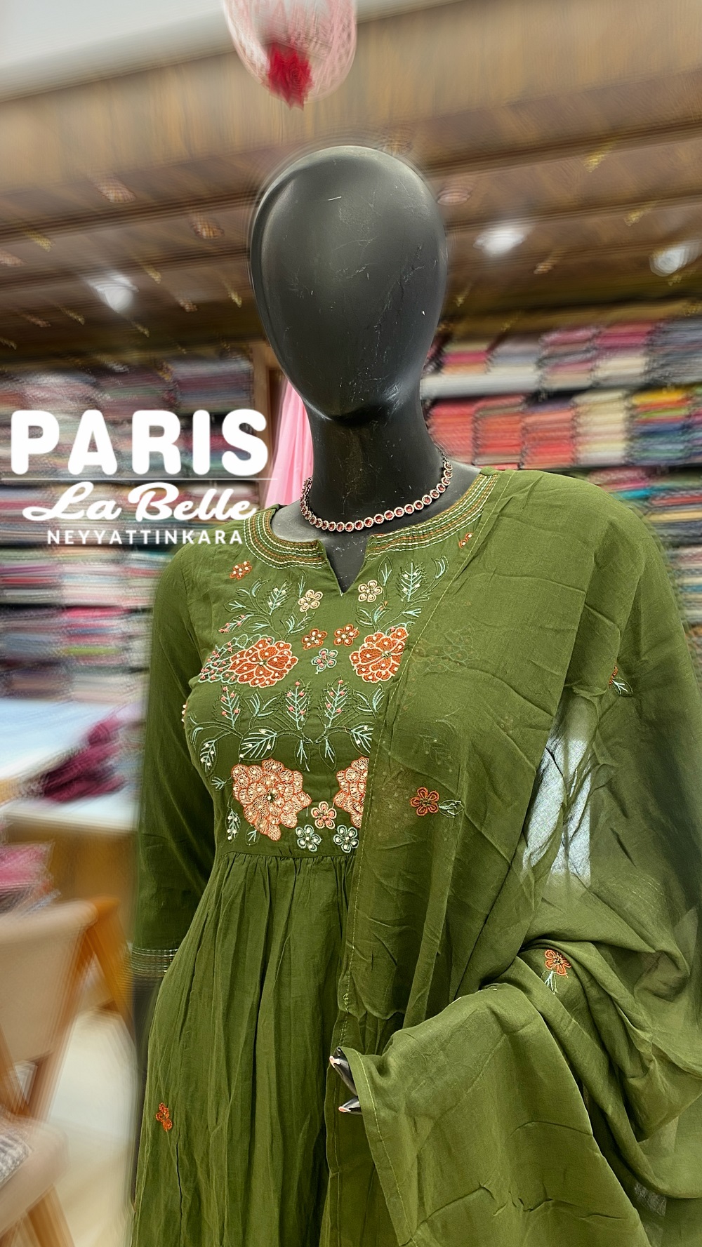 The garment has a modest V-neckline with a thin embroidered border and three-quarter length sleeves.