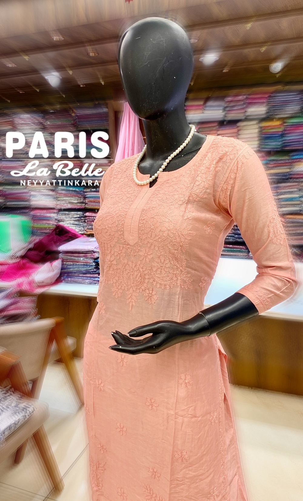 This is a knee-length, straight-cut tunic in a soft peach hue. It features extensive Lucknowi Chikankari embroidery