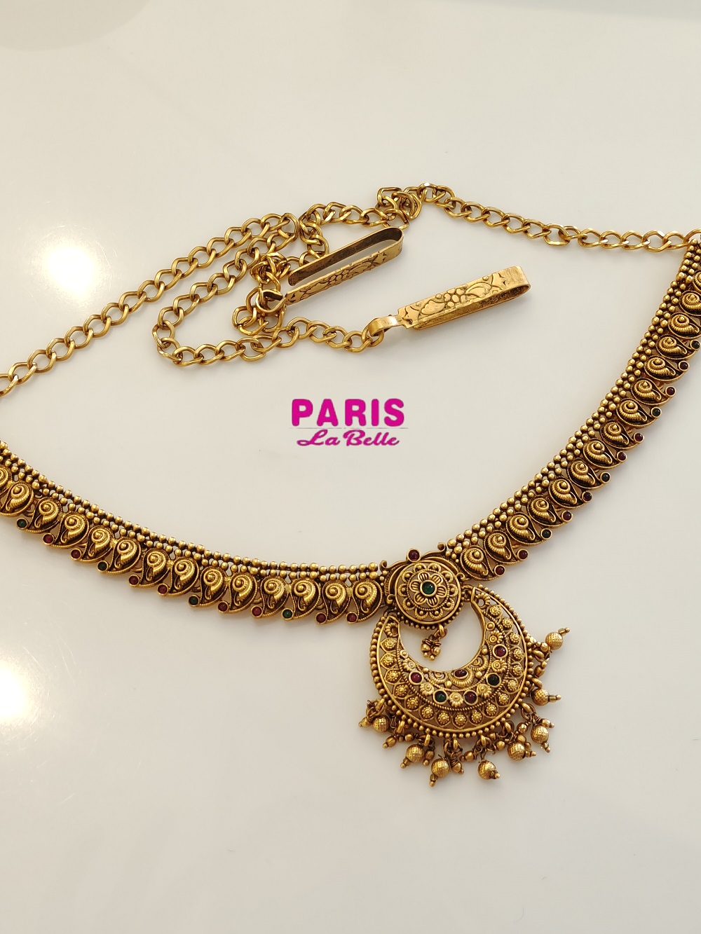 A Vaddanam (also known as a Kamarband or Ottiyanam), which is a traditional Indian hip chain designed to match the necklace set.