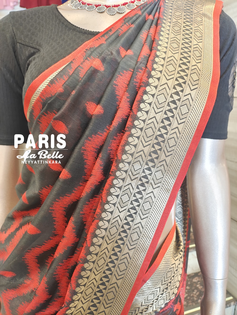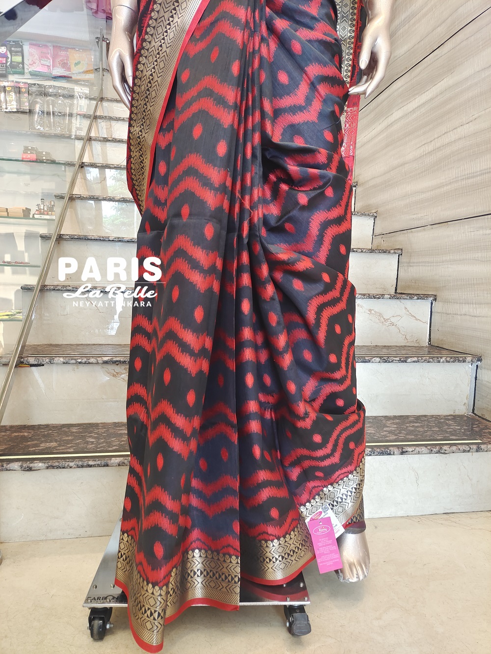 The saree features a Pochampally pattern. A classic high contrast combination of charcoal black and crimson red.