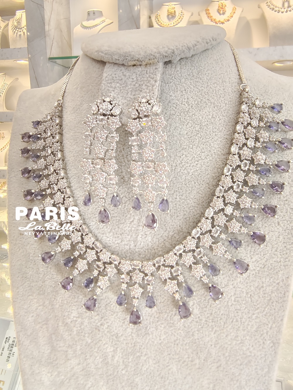 A matching duo consisting a bib style necklace and a long chandelier earring.