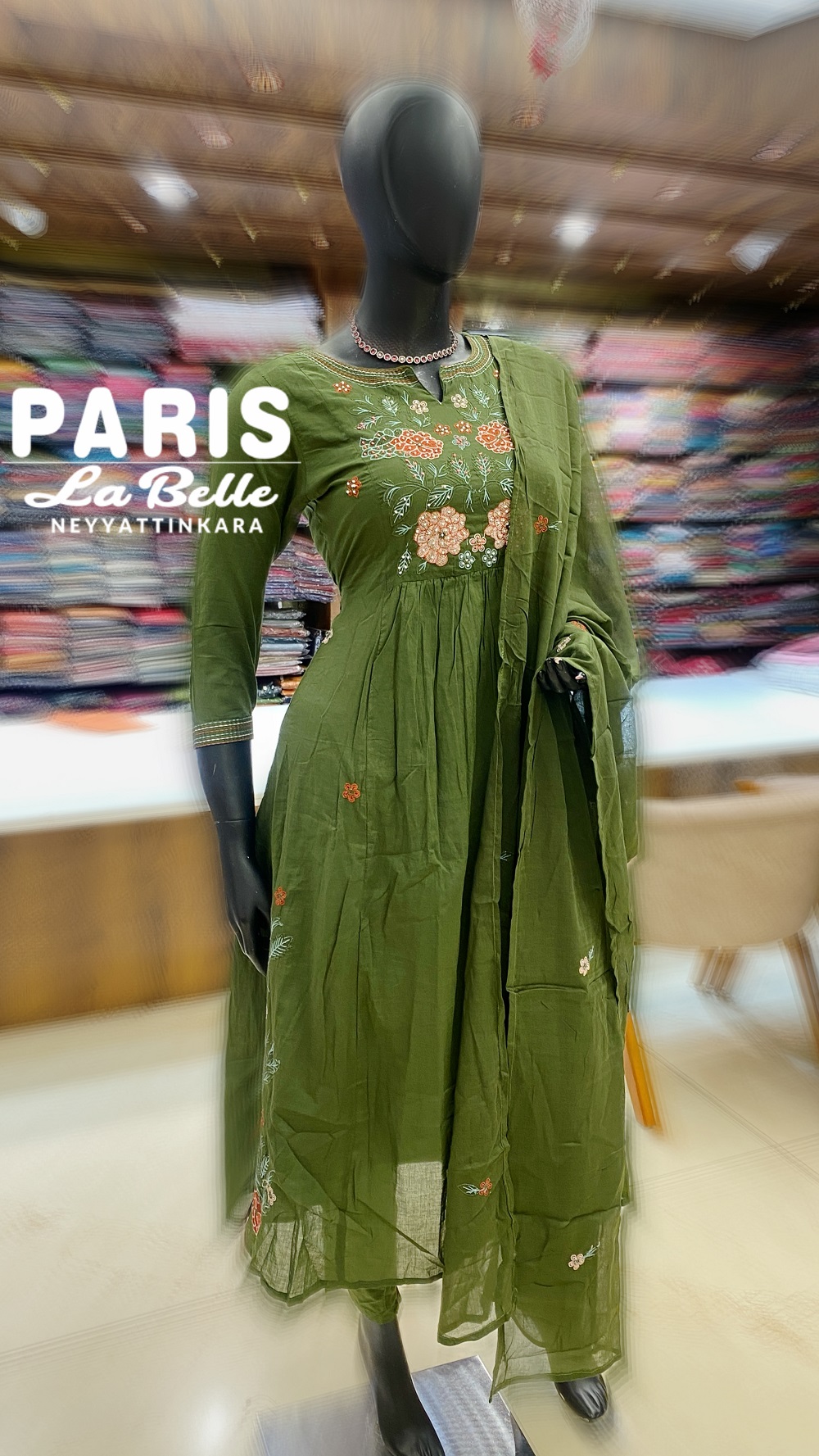 The garment has a modest V-neckline with a thin embroidered border and three-quarter length sleeves.