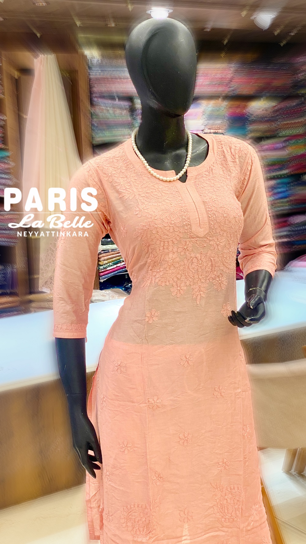 This is a knee-length, straight-cut tunic in a soft peach hue. It features extensive Lucknowi Chikankari embroidery