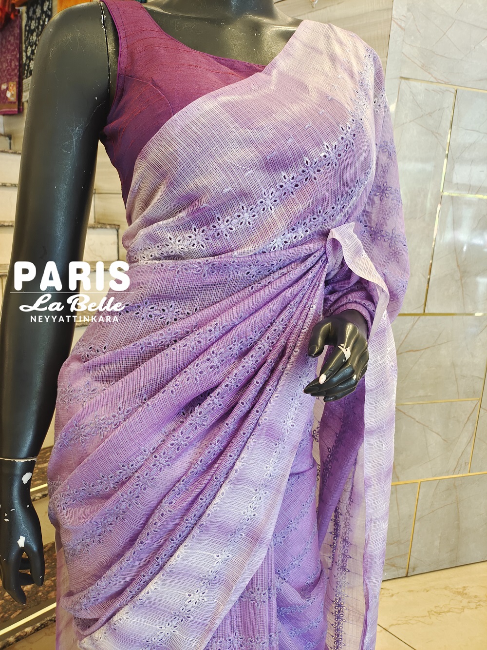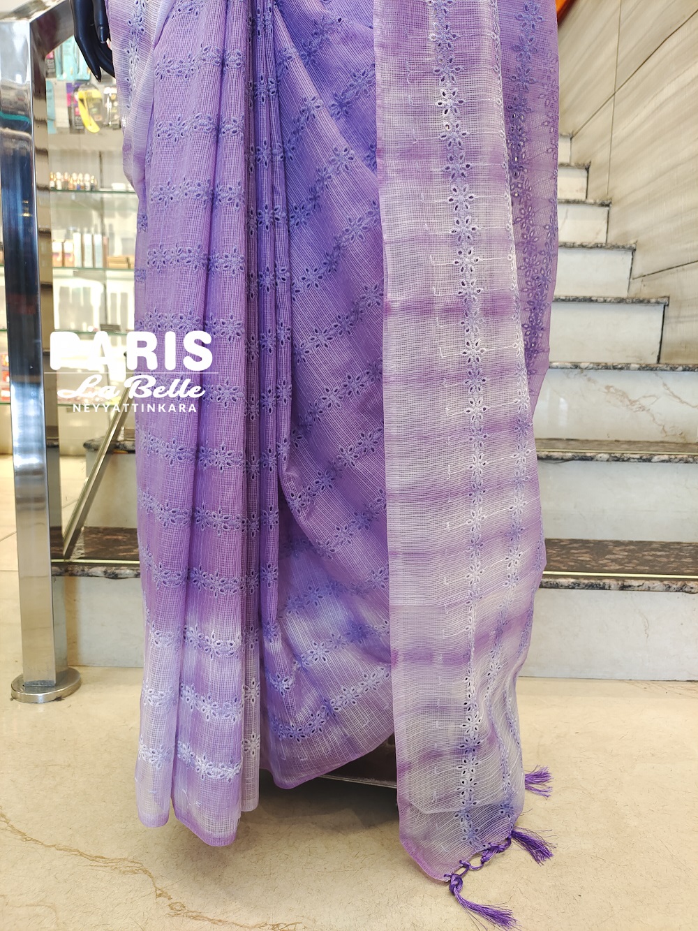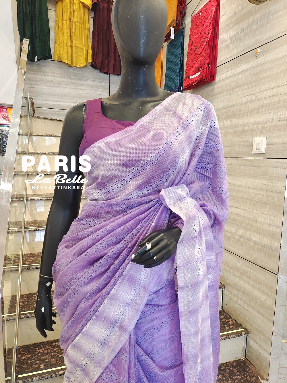 This lavender saree offers a softer, more ethereal vibe, featuring a beautiful play on gradients and delicate textures.