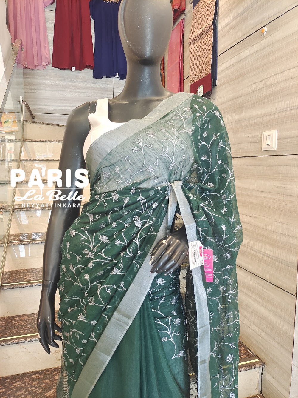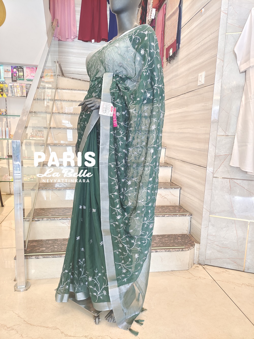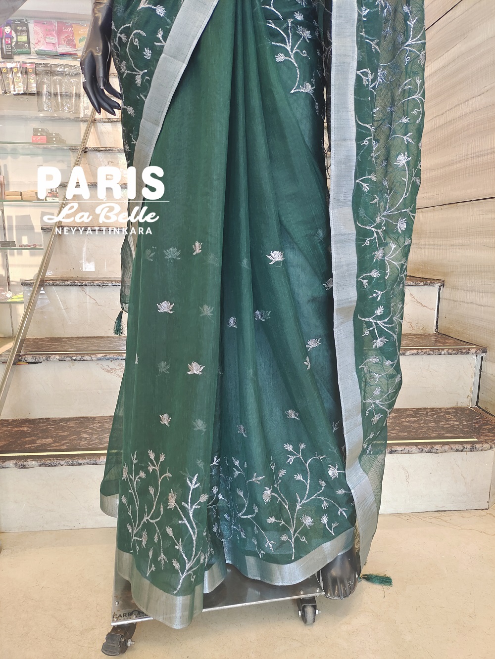 Forest green base paired with silver accents. The saree features intricate silver floral vine embroidery.